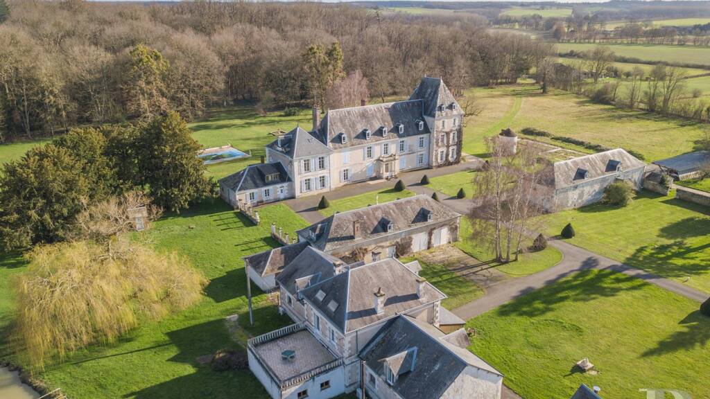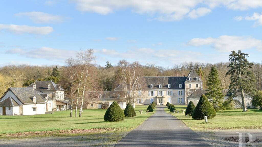 The seigneurial home that was built here on the ruins of a medieval mansion, of which no vestiges remain, was endlessly redesigned until it collapsed in 1860. In 1890, the decision was made to rebuild the edifice on the site. A renowned architect, Louis-Alfred Trolliet, a specialist in the reconstruction of chateaux, was entrusted with this task. He was responsible for the edifice you can see here today. Trolliet was nicknamed 'the Viollet-le-Duc of the Berry province' in a nod to the famous 19th-century French architect Eugène Emmanuel Viollet-le-Duc who restored many medieval monuments. Trolliet won his spurs as a leading figure of the Troubadour style in French architecture with his restoration of the Château de Romefort in the town of Ciron. To rebuild the present property, he did not adopt the Troubadour style but rather the style of the Loire Valley chateaux that was also in vogue at the time. Trolliet opted for a long rectangular dwelling crowned with tall hipped roofs of slate tiles recalling the Château de Chenonceau and the Château d'Azay-le-Rideau. The grand edifice comes into view once you have gone through the entrance gate and made your way up the long central drive punctuated symmetrically with topiary box shrubs neatly clipped into cones. The château faces east and west. Its main section has a ground floor, a first floor and a second floor in the roof space. The adjoining square tower has a third floor in its roof space. The symmetrical elevations are rendered and punctuated with large small-paned windows fitted with wooden louvred shutters that are painted sky blue. Gabled dormers punctuate the roof of the main section and that of the square tower. Beyond the château, the drive crosses dense woodland on this estate, which covers around 30 hectares and includes a 1.2-hectare lake. Trolliet also decided to build two large lodges as foreparts of the château exactly opposite it. These two buildings are rectangular. They have a ground floor and a first floor. A third lodge stands at a right angle to one of them. This third structure has an eclectic style and recalls a train station. On the south side, a circular dovecote with a cone roof of terracotta tiles adorns the grounds. On the east side, there is a heated swimming pool. Behind the outhouses, a secondary entrance leads to a gravelled car park. Lastly, on the north-west side, there is a private lake. In the middle of this lake there is a small tree-dotted island.