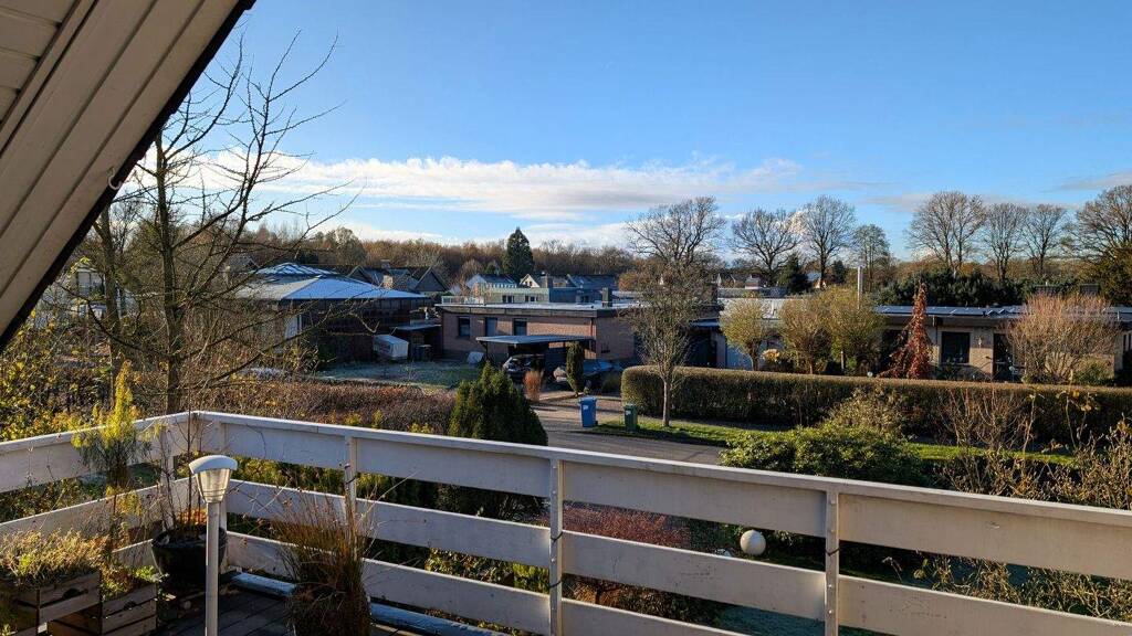 Die Dachgeschosswohnung verfügt über einen seitlich gelegenen, separaten Zugang, der zunächst in einen kleinen Vorflur mit Innentreppe führt. Diese erschließt den Wohnbereich im Dachgeschoss und mündet in eine außergewöhnlich großzügige Diele. Ein besonderes Highlight ist die offene Gestaltung bis in die Dachspitze: Da innerhalb der Essdiele keine Zwischendecke verbaut ist, entsteht ein luftiges, repräsentatives Raumgefühl mit Galeriecharakter. Von der zentralen Diele aus gelangt man in das geräumige Wohnzimmer sowie auf die attraktive Balkonterrasse, die sowohl einen überdachten Freisitz als auch eine Markise für sonnige Tage hat und damit bei nahezu jeder Wetterlage nutzbar ist.