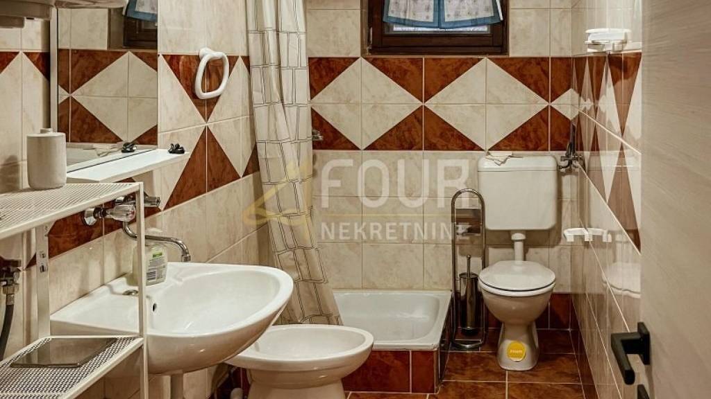 Zum Verkauf steht eine Wohnung mit einer Fläche von 55,15 m2 in einer ruhigen und angenehmen Umgebung von Einfamilienhäusern. Die Wohnung ist voll möbliert und besteht aus einem Flur, einem Badezimmer, einem Vorraum, einem Schlafzimmer, einem Wohnzimmer, einer Küche mit Essbereich und einem Balkon mit 10 m2 mit Blick auf das Meer in der Ferne. Zur Wohnung gehört auch ein Abstellraum im Keller und ein Teil des Grundstücks - ein Garten. Die Wohnung verfügt über eine Klimaanlage und einen Holzofen, PVC-Fenster in allen Räumen außer im Badezimmer. Ein Parkplatz ist vorhanden.