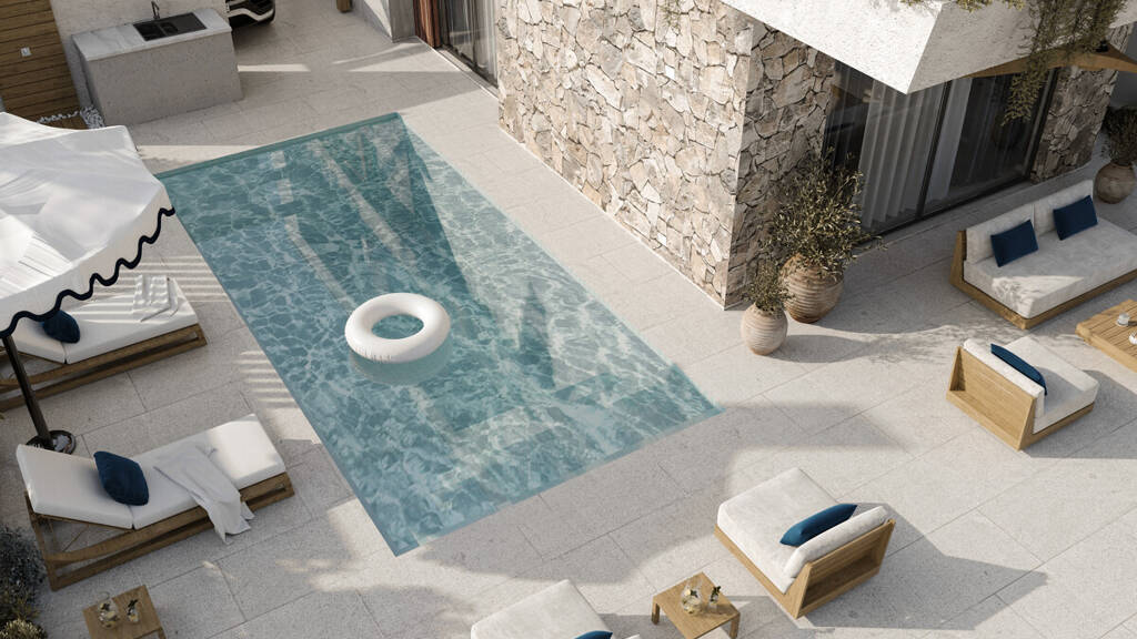 Die Architektur folgt einer klaren, minimalistischen Linie und wird durch natürliche Materialien und warme Steinakzente ergänzt, die den mediterranen Charakter der Anlage unterstreichen. Großzügige Glasflächen lassen Licht und Meeresbrise durch die offenen Räume fließen, während die harmonische Verbindung von Innen- und Außenbereichen ein Lebensgefühl schafft, das bis zu 360 Sonnentage im Jahr zelebriert.