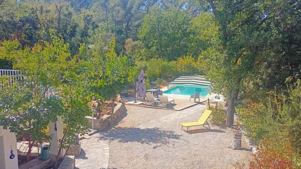 Der üppige und sorgfältig angelegte Garten ist ein wahres Refugium der Ruhe. Er ist vor Blicken geschützt und bietet schattige Wege und Ecken, die zum Träumen einladen. Hier kann man sich schon vorstellen, unter Bäumen zu essen oder am Wasser zu entspannen. Der Pool ist durch eine verschiebbare Struktur geschützt, sodass Sie das Baden zu jeder Jahreszeit genießen können.