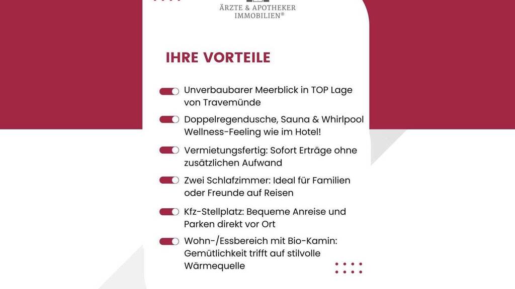 Willkommen in Ihrer neuen Wohlfühloase an der Ostsee - inmitten des beliebten "Beach Bay Travemünde" am Priwall! Diese exklusive 3-Zimmer-Eigentumswohnung in einer der stilvollen Strandvillen vereint modernes Design mit einem durchdachten touristischen Konzept und bietet Ihnen einen fantastischen Blick auf den Hafen und die Trave.