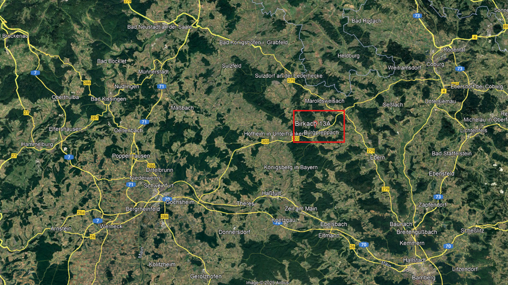 Die Städte Schweinfurt, Coburg oder Bamberg liegt zwischen 30 und 45 Fahrminuten entfernt und bietet sämtliche Einkaufs-, Kultur- und Freizeitangebote sowie ein vollständiges Angebot an Schulen, Ärzten und öffentlichen Einrichtungen. Damit ist Birkach ideal für alle, die ein großzügiges Grundstück in naturnaher Lage suchen, ohne auf die Nähe zu einem urbanen Zentrum verzichten zu wollen.