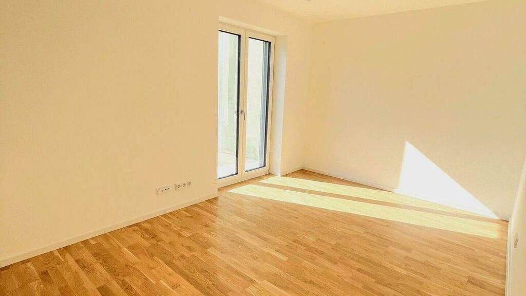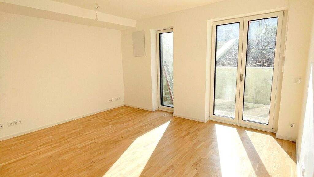 Sowohl vom Wohnbereich als auch vom Schlafzimmer aus ist die über die gesamte Wohnungsbreite verlaufende Terrasse zugänglich. Diese bietet ausreichend Fläche für einen Essbereich sowie eine Sitz- oder Loungebereich und erweitert den Wohnraum in den Außenbereich.