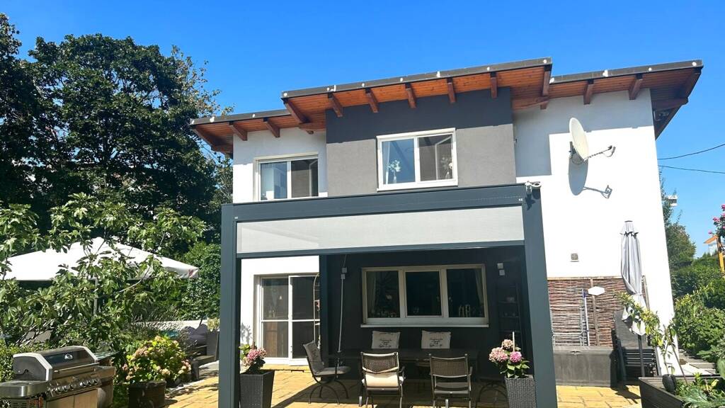 Vom Vorraum aus gelangen Sie in den hellen und in warmen Farben gestalteten Wohnbereich, mit angrenzendem Essbereich und in die offene Küche. Ebenso gelangen Sie vom Wohnzimmer aus auf die herrliche Terrasse, die erst vor kurzem mit einer hochwertigen Terrassenüberdachung ausgestattet wurde, wie auch in den sonnigen Garten und in den Pool mit Holzdeck. Weiters befindet sich ein Gäste-WC auf dieser Etage und der separate Abgang in das Kellergeschoss.