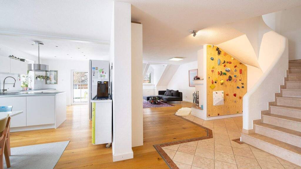 Beim Betreten der Dachgeschosswohnung sticht Ihnen gleich das Herzstück ins Auge - der lichtdurchflutete Wohn- und Essbereich. Zu Ihrer rechten Seite befindet sich ein geräumiger Garderobenbereich. Gegenüber gelegen ist ein großzügiges Tageslicht-Badezimmer, ausgestattet mit hochwertigen Marmorfliesen, Eckbadewanne sowie Waschtisch und Toilette von Pozzi Ginori. Vom Flur aus gelangt man in das große Esszimmer, von welchem man in die moderne Nolte-Einbauküche gelangt. Die Küche ist mit einer Kochinsel ausgestattet und im Kaufpreis inbegriffen. Ebenfalls vom Eingangsflur aus kommt man in das weitläufige Wohnzimmer. Darin befindet sich ein gemütlicher Kachelofen mit Glasfront. Dieser wurde jedoch stillgelegt. Der Umstieg auf einen modernen Schwedenofen ist laut den Eigentümern jederzeit möglich. Der Bereich unterhalb der Treppe kann wunderbar als offene Spiel-/Lese-Ecke genutzt werden. Außerdem befindet sich auf dieser Ebene noch ein weiteres Zimmer mit einem praktischen, vom Schreiner gefertigten, Einbauschrank. Dieses Zimmer kann perfekt als Arbeits- oder Schlafzimmer genutzt werden. Von der Küche aus gelangt man auf die ca. 14 m² große Süd-Dachterrasse mit Ihren zwei Markisen. Auf der Dachterrasse wurde im Jahr 2020 ein neuer WPC-Boden verlegt und ein Kunststoff/Alu-Geländer in Milchglasoptik angebracht. Ob ein sonniges Frühstück oder ein lauer Sommerabend, diese Dachterrasse lädt zum Genießen ein.