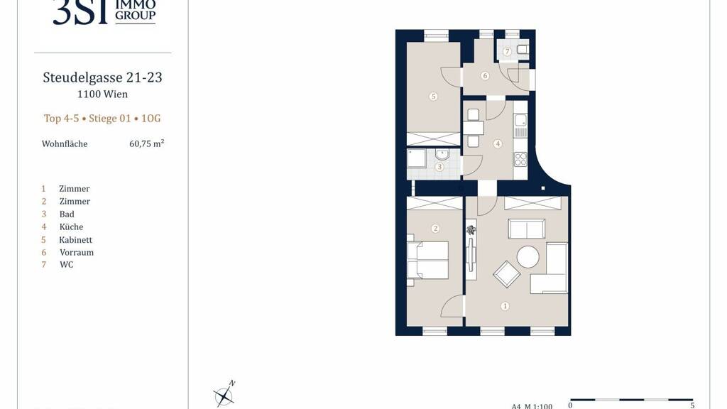 Vom geräumigen Vorraum aus, gelangen Sie in das hofseitig, nach Osten ausgerichtete Schlafzimmer, die Küche, sowie das getrennt begehbare WC.