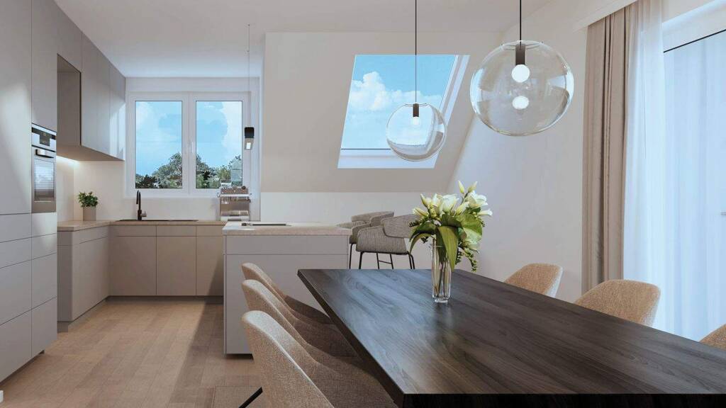 Schon beim Ankommen über den Aufzug direkt in die Wohnung verändert sich etwas. Der Raum öffnet sich, das Licht übernimmt und der Blick wandert. Der Wohn- und Essbereich ist nicht inszeniert - er ist ehrlich großzügig. Ein Ort, an dem Gespräche länger dauern dürfen und Abende nicht geplant werden müssen. Ein Kamin fügt sich elegant ein und schafft jene Wärme, die man nicht misst, sondern spürt.
