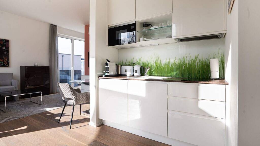 Der großzügige Balkon lädt zum Entspannen mit Blick ins Grüne ein, während Klimaanlage, WLAN und elektrische Sonnenrollos jederzeit für Komfort sorgen. Ein hauseigener Lift bringt Sie direkt aus der Tiefgarage, in der auch Ladestationen für E-Autos und Abstellplätze für Räder zur Verfügung stehen.