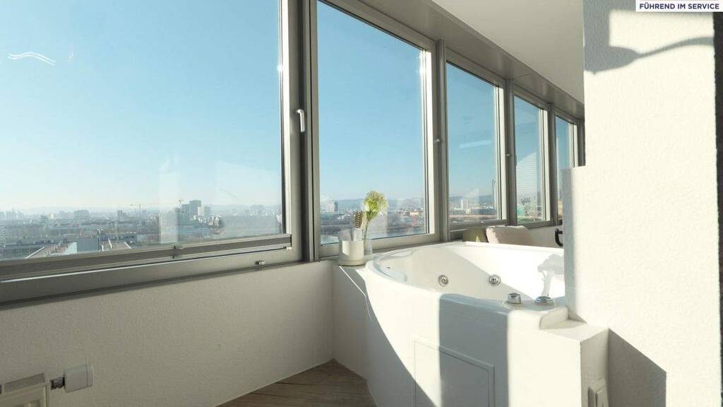 Eine der seltenen großformatigen Residenzen des gefeierten Architekten-Duos Delugan & Meissl - über 200 m² Wohnluxus mit weitläufigen Loggien, beeindruckenden Glasfronten und atemberaubendem Blick in den Donaupark zum Donauturm.