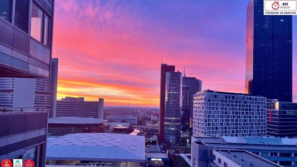 . Großzügige Panoramafenster (Kunststoff/Alu, 2-fach) mit Blick über Wien, den Donaupark bis zu den Wiener Hausbergen