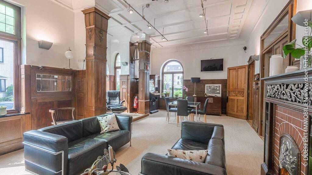 - Erdgeschoss: Repräsentative Diele mit kunstvoller Holztreppe, Gäste-WC, großzügiger Wohnbereich mit historischem Kamin-Element (nicht in Betrieb, Beheizung über Heizkörper), Salon mit Zugang zu Veranda und Balkon