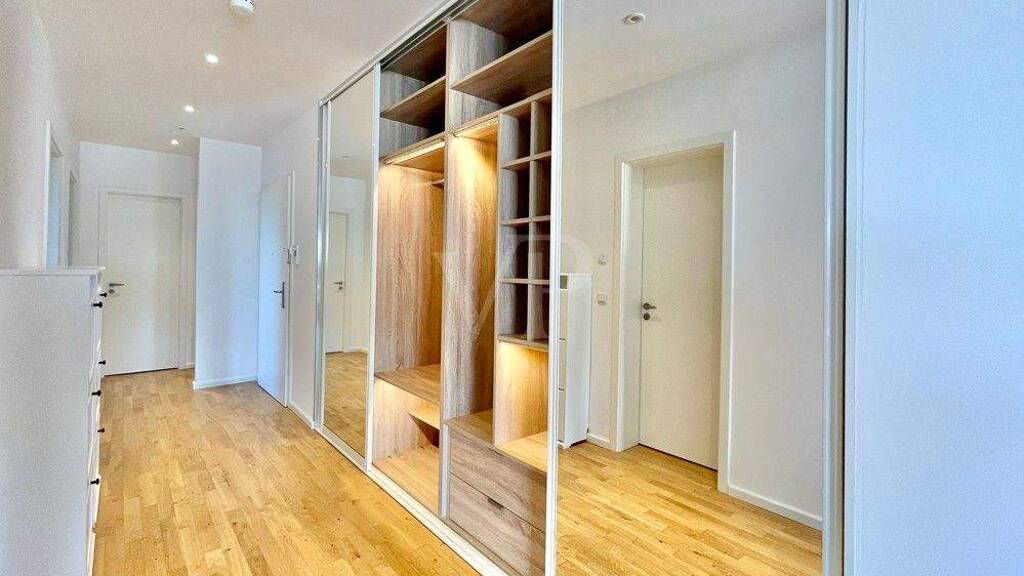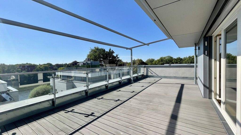 Das Raumkonzept unterteilt sich in ein geräumiges Zimmer mit angrenzendem modernen Wannenbad, ein gemütliches Schlafzimmer, ein weiteres Bad mit ebenerdiger Dusche und einen weitläufigen Wohn- und Essbereich. Neben einer Anschlussmöglichkeit für einen Kaminofen befindet sich hier auch die hochwertige Marken-Einbauküche, die mit modernen, teils neuwertigen Elektrogeräten ausgestattet ist. Eine geräumige Diele präsentiert sich mit einem großen Einbauschrank, welcher viel Stauraum bereithält. Besonderes Highlight ist aber die ca. 50 m² große Terrasse, die nicht nur mit ihrer Größe, sondern auch mit einer Pergola als elektrisch betriebenes Sonnenschutzsystem beeindruckt. Diese ist umlaufend und von jedem Zimmer aus zu betreten. Neben hübschen Fliesen in den Bädern unterstreicht hochwertiges Eichenparkett den edlen Charakter dieser Wohnung. Diese besondere Wohnung bietet Ihnen nicht nur eine erstklassige Lage, sondern auch eine Vielzahl hochwertiger Ausstattungsmerkmale, die Ihren Wohnkomfort auf ein neues Niveau heben. Diese Wohnung vereint Luxus, Funktionalität und modernes Design auf höchstem Niveau. Hier können Sie Ihren Wohntraum in vollen Zügen genießen. Vereinbaren Sie noch heute einen Besichtigungstermin und lassen Sie sich von dieser exklusiven Immobilie beeindrucken.