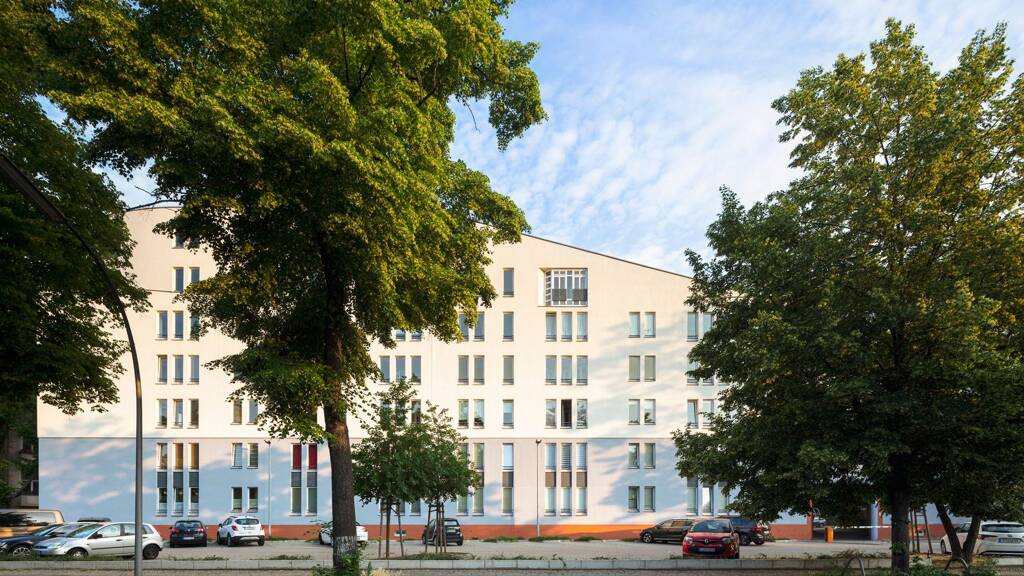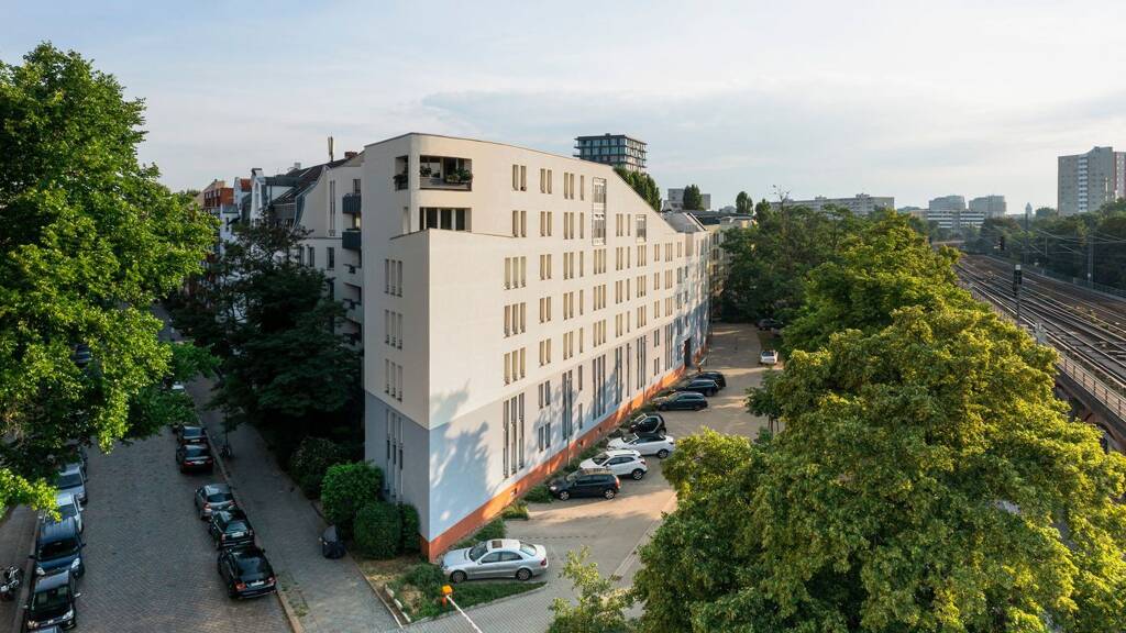 Willkommen im FLOTOW - In The Spot. Das 1984 erbaute Wohnensemble in der Flotowstraße, Ecke Bachstraße im Hansaviertel in Berlin-Tiergarten fällt mit seiner markanten Architektur ins Auge, die sich durch individuelle Fassaden- und Grundrissgestaltung auszeichnet. Das spitz zulaufende Gebäude ist in den Jahren 2016/17 umfassend modernisiert worden. Seitdem erstrahlen die Fassaden und Treppenhäuser in einem hellen und einladenden Farbkonzept.
