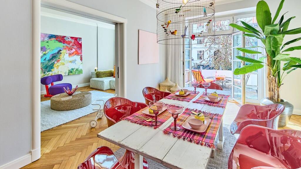 Der Wohn- und Essbereich bildet das Herzstück der Wohnung. Beide Räume können durch eine stilvolle Schiebetür miteinander verbunden oder getrennt werden - eine flexible Lösung für Familienalltag und Gäste. Während der Essbereich Raum für gemeinsame Mahlzeiten und gesellige Abende bietet, lässt sich das Wohnzimmer als gemütlicher Rückzugsort gestalten. Das frisch überarbeitete Fischgrätparkett und die zeittypischen Stilelemente verleihen den Räumen eine warme, klassische Atmosphäre.