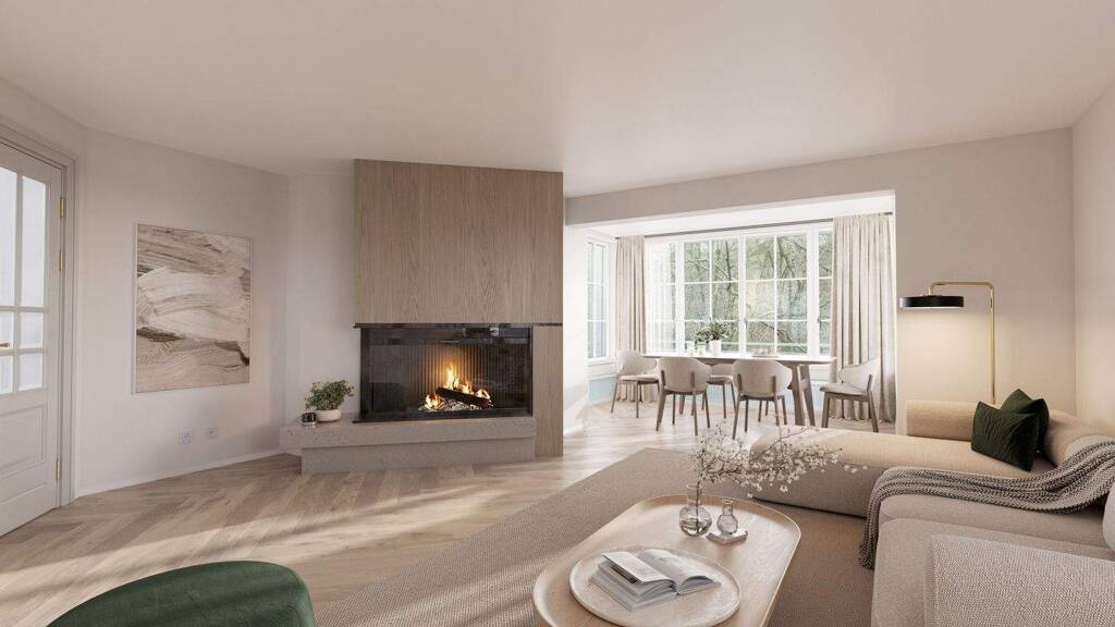 Über einen großzügigen Eingangsbereich gelangt man in das Herzstück der Wohnung. Der großzügige Wohnbereich mit Erker erstreckt sich über 34 m² und ist nach Süd-Osten ausgerichtet. Dem Wohnbereich mit Kamin ist eine Bibliothek mit Einbauschränken angrenzend.