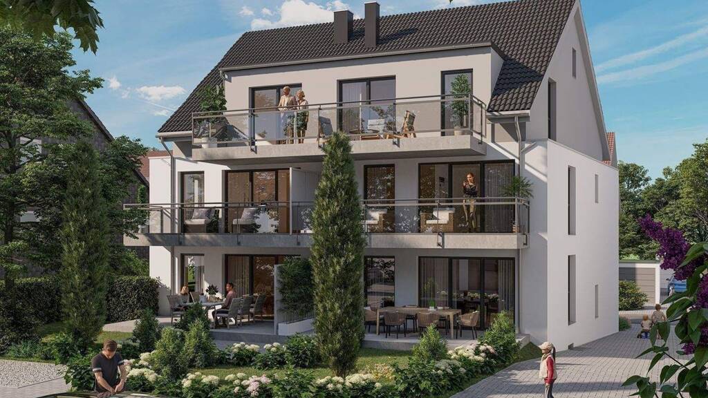 Die Architektursprache bewusst gewählt, mit weißen Fassaden, Spitzdach unter schwarzer Pfanne, erhabenen Gauben, ausgesuchten, anthrazitfarbenen, überwiegend bodentiefen Fenster- Türanlagen, respektablen Sonnenbalkonen in den Bel-Etagen und Dachgeschossen und Terrassen an den Erdgeschosswohnungen mit deren Privatgärten – einladend & beindruckend.