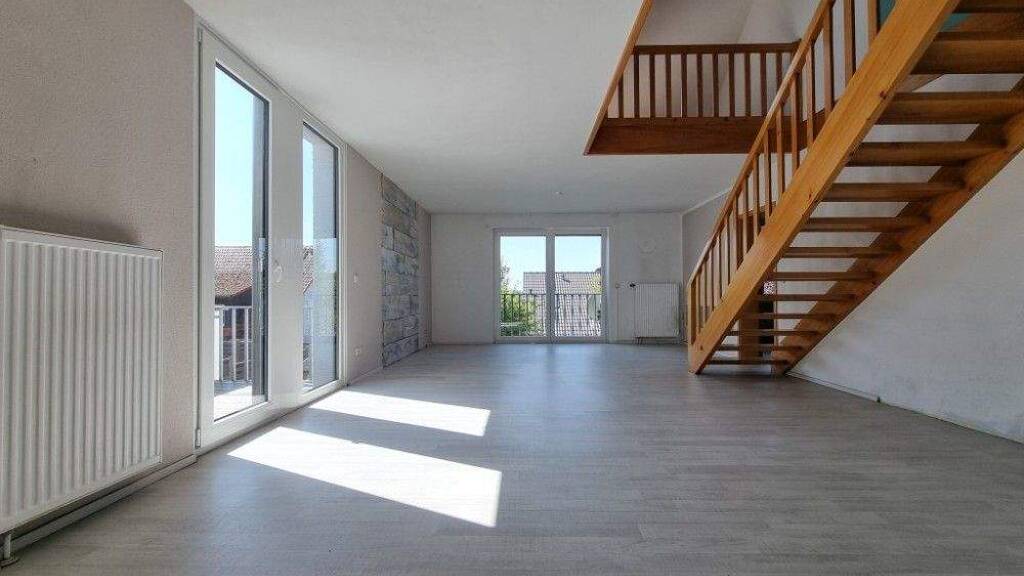 angenehm helle Räume offene Küche Einbauküche mit Esstheke, aber ohne Elektrogeräte 2 Bäder kleiner Balkon mit Zugang zur Garage dekorative Massivholztreppe zur 2. Ebene dekorative Sichtholzbalken pflegeleichte Laminatbodenbeläge