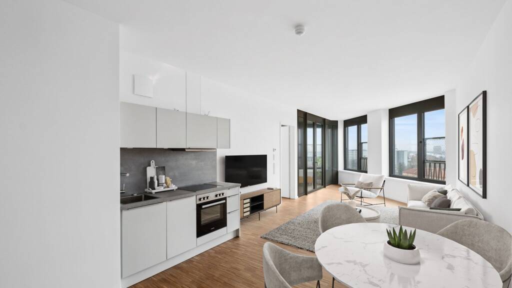 Dieses helle 2-Zimmer-Apartment vereint durchdachtes Design mit funktionaler Eleganz. Die offene, stilvolle Küche verschmilzt nahtlos mit dem großzügigen Wohnbereich und schafft den perfekten Raum für Alltag, Entspannung und Gäste.