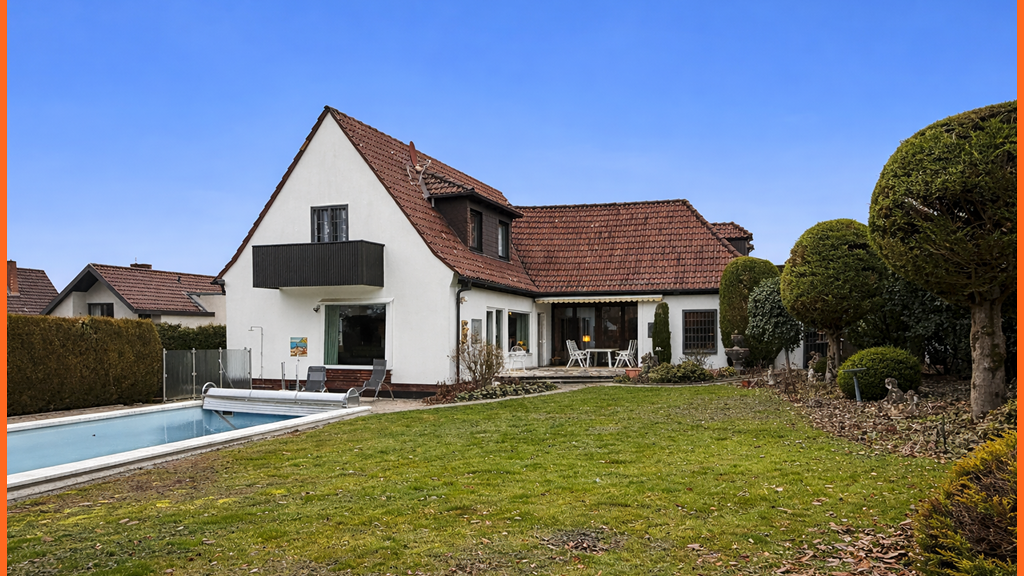Diese außergewöhnliche Villa vereint exklusives Wohnen mit zeitloser Architektur und einem beeindruckenden Freizeitwert. Auf ca. 216 m² Wohnfläche verteilen sich 7-8 Wohnräume, die ein repräsentatives und zugleich behagliches Wohnambiente schaffen. Der Grundriss ist durchdacht, lichtdurchflutet und bietet Raum für individuelle Lebenskonzepte. Herzstück des Hauses ist das helle 50 m² große Wohnzimmer mit seinem stilvollen Kaminofen. Die großen Fensterfronten ermöglichen einen herrlichen freien Blick in den eindrucksvollen Garten, wobei das eingewachsene Grundstück einen fast vollständigen Sichtschutz bietet. Ebenfalls ein Highlight ist die hochwertig ausgestattete Küche mit tiefergesetzter Kochmulde und angrenzender Anrichte, die Funktionalität und Design auf hohem Niveau verbindet. Eine kleine Speisekammer bietet Platz für Vorräte. Direkt daneben ein gemütlicher Essplatz an dem Sie mit Ihren Freunden so manchen "weinseligen" Abend verbringen werden. Der imposante Flurbereich mit seinen liebevollen Details und den bleiverglasten Fenstern zeugt vom außergewöhnlich gutem Geschmack des Besitzers. Eine stilvolle Treppe führt in das Obergeschoss. Dort befinden sich 5 Schlafräume und 2 Bäder. Den vielseitig nutzbaren Speicher erreicht man über eine elektrische Bodentreppe. Das Haus ist voll unterkellert und bietet zusätzliche Nutz- und Abstellflächen, ideal für Hobby, Fitness oder Wellness. Das 1661 m² große Grundstück überzeugt durch seine Privatsphäre und seine außergewöhnliche Außenanlage. Ein Schwimmbad und eine Außensauna schaffen echtes Urlaubsfeeling im eigenen Zuhause. Die sichtgeschützte Terrasse lädt zu entspannten Stunden ein und macht das Leben im Freien zu einem täglichen Genuss. Abgerundet wird dieses besondere Angebot durch eine Doppelgarage, eine Einzelgarage sowie zusätzliche Stellplätze davor. Die Lage ist ruhig und doch zentral exponiert - stadtnah, exklusiv und ideal für alle, die Wert auf Ruhe, Privatsphäre und eine hervorragende Anbindung legen.