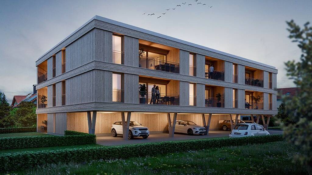 Das Wohnhaus wird ganzheitlich als Holzbau ausgeführt. Das bringt zahlreiche Vorteile für die Bewohner, denn Holz regelt auf natürliche Art und Weise das Raumklima. Neben einer hochwertigen Holzfassade kommen bodentiefe Holzfenster zur Ausführung. Mit der Anbringung einer Photovoltaikanlage sowie einer Luftwärmepumpe auf dem Dach bietet das Wohnhaus ein nachhaltiges, zukunftsfähiges Energiekonzept.