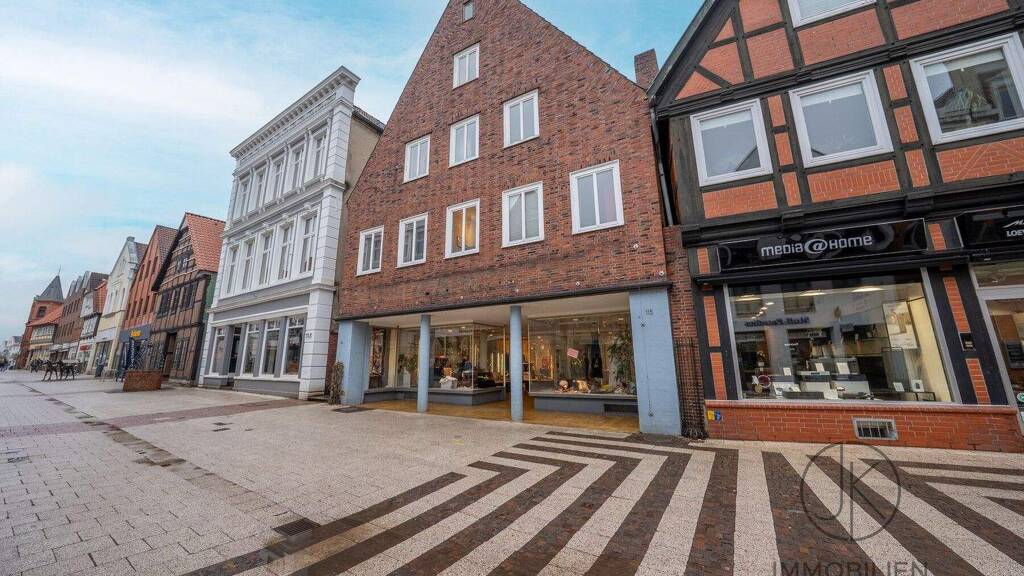 Mitten im Herzen der Verdener Innenstadt präsentiert sich dieses Wohn- und Geschäftshaus mit einer Gesamtfläche von ca. 688 m², davon ca. 200 m² Wohnfläche und ca. 488 m² Gewerbefläche, als klassisches innerstädtisches Handelshaus mit gewachsener Struktur und vielseitigen Nutzungsmöglichkeiten. Die giebelständige Backsteinfassade fügt sich harmonisch in das historische Straßenbild der Großen Straße ein und vermittelt bereits von außen den Charakter eines traditionellen Geschäftshauses, wie er für lebendige Altstadtlagen typisch ist. Große Schaufensterflächen im Erdgeschoss schaffen eine offene, einladende Wirkung zur Straße und sorgen für eine ausgezeichnete Sichtbarkeit des Gewerbebereichs. Das dazugehörige Grundstück umfasst eine Größe von ca. 783 m² und bietet damit eine für Innenstadtlagen bemerkenswert großzügige Fläche.
