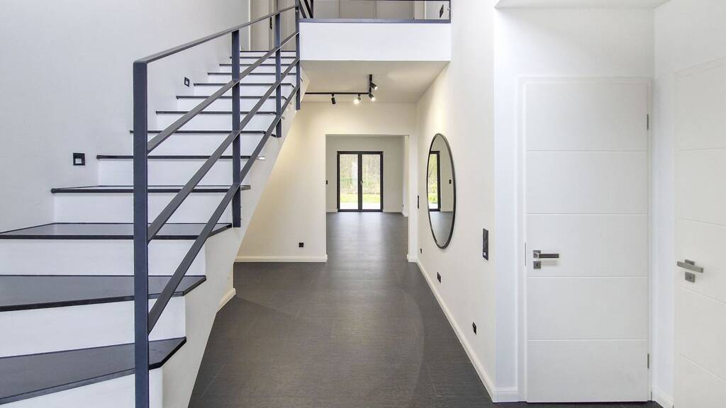 Bereits beim Betreten empfängt Sie eine großzügige Diele mit beeindruckender Galerie, die dem Haus eine offene und luftige Atmosphäre verleiht. Rechts befinden sich ein modernes Gäste-WC mit ebenerdig gefliester Dusche und Fenster sowie ein separater Garderobenraum mit ausreichend Platz für Jacken, Schuhe sowie Waschmaschine und Trockner. Links liegt ein flexibel nutzbares Zimmer, das sich ideal als Homeoffice, Gästezimmer oder Spielbereich eignet. Besonders praktisch ist der direkte Zugang von der Diele in die Garage.