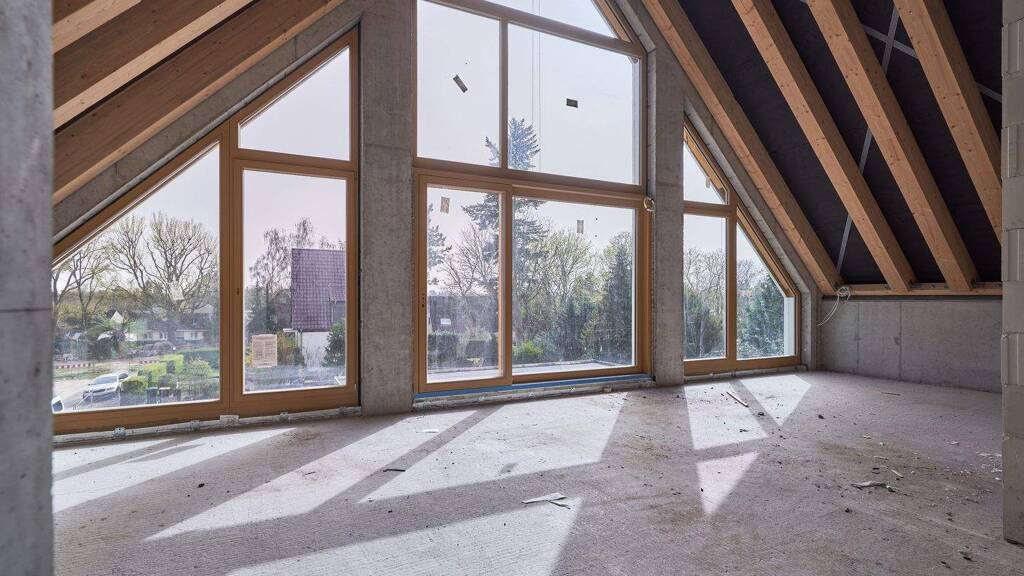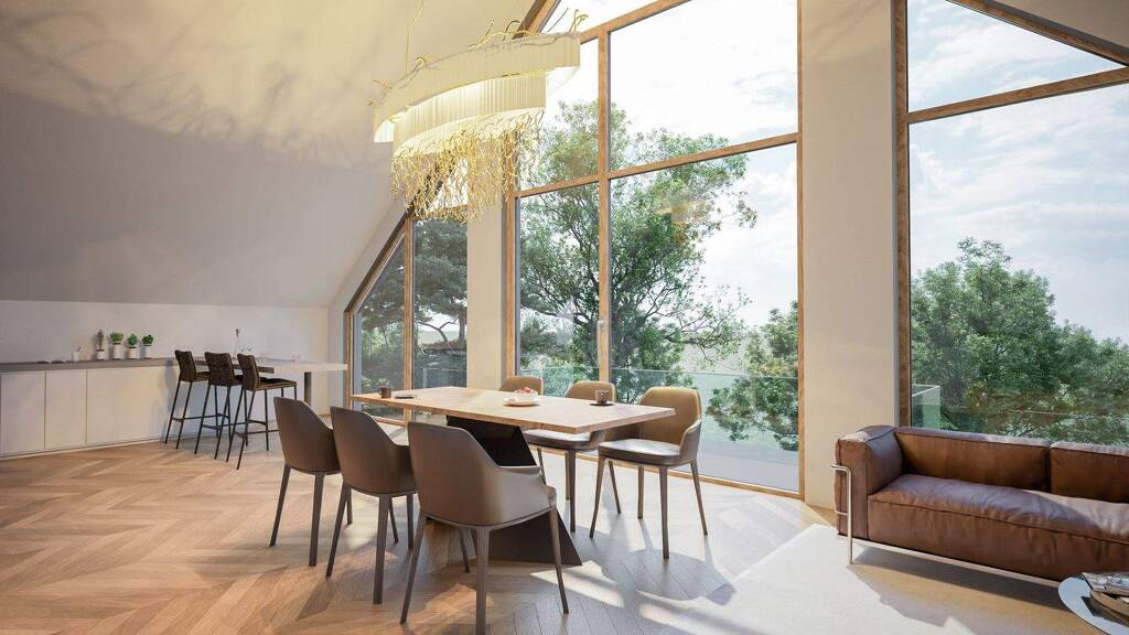 Besonders die Dachgeschosswohnung dieses Neubaus strotzt vor Exklusivität mit ihren hohen Decken und der unglaublichen Glasfassade, welche dem Wohn-, Ess-, und Küchenbereich einen einmaligen Look gibt. In der zweiten Ebene präsentiert sich ein Atelier, welches idealerweise als Arbeitsraum genutzt werden kann.