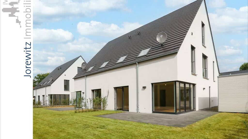 Weitere Ausstattungsdetails: - Weiß verputzte Fassade; farblich abgesetzter Eingangsbereich - Großzügige, bodentiefe Kunststoff-Isolierfenster (dreifach verglast) mit anthrazitfarbenen Rahmen - Parkettboden aus Eiche - warm, pflegeleicht und strapazierfähig - Erdwärmepumpe mit Fußbodenheizung - kontrollierte Wohnraumlüftung für ein optimales Raumklima - Elektrische Rollläden zur effektiven Beschattung - Diele mit separater, platzsparender Garderobe - Großzügiger, lichtdurchfluteter Wohn-/Essbereich mit Blick in den Garten Offener Kochbereich; nahtlose Verbindung zu Ess- und Wohnraum; vorbereitet für eine Kücheninsel als eleganter Raumteiler - Familienbad im Dachgeschoss: moderne Naturtöne, Doppelwaschbecken, bodengleiche Dusche und Badewanne Hauswirtschaftsraum mit zusätzlicher Staufläche; Abstellmöglichkeiten auch unter der Treppe - Studio im Spitzboden: ca. 25 m² - ideal als Homeoffice oder Gästezimmer; vielseitig nutzbar - Garten: pflegeleicht angelegt; Buchenhecke für Privatsphäre; Terrasse und Rasenfläche - Außenanlagen: Carport mit integriertem Abstellraum für Fahrräder - Vorbereitung für eine Photovoltaikanlage (Leitungsführung vorhanden)