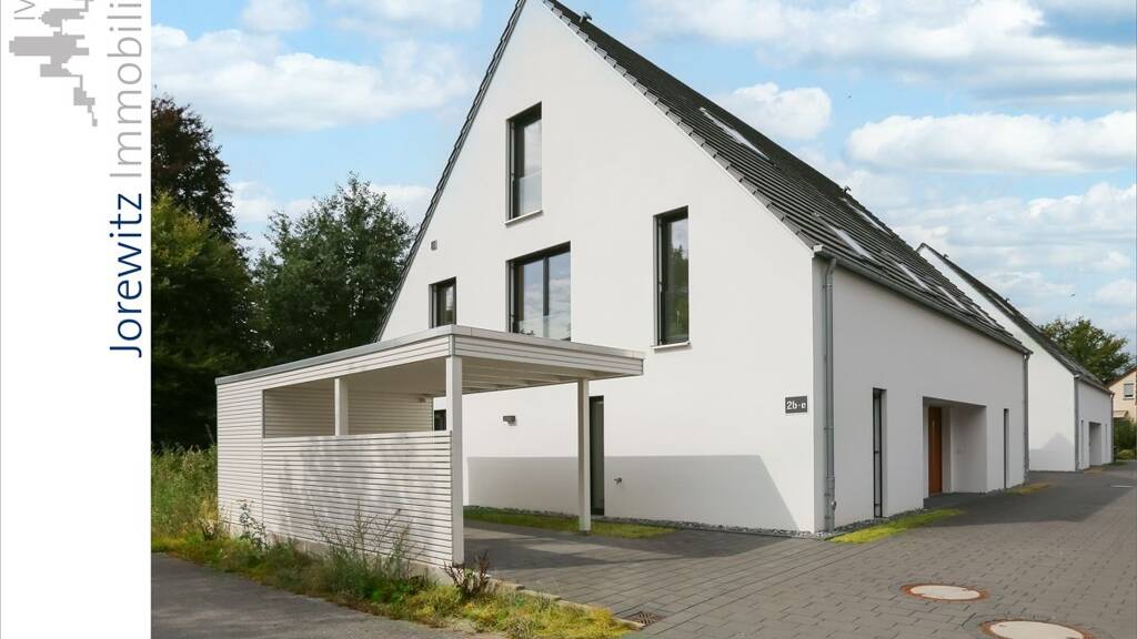 Moderne Doppelhaushälfte im KfW-Effizienzhaus-55-Standard mit Carport und pflegeleichtem Garten.