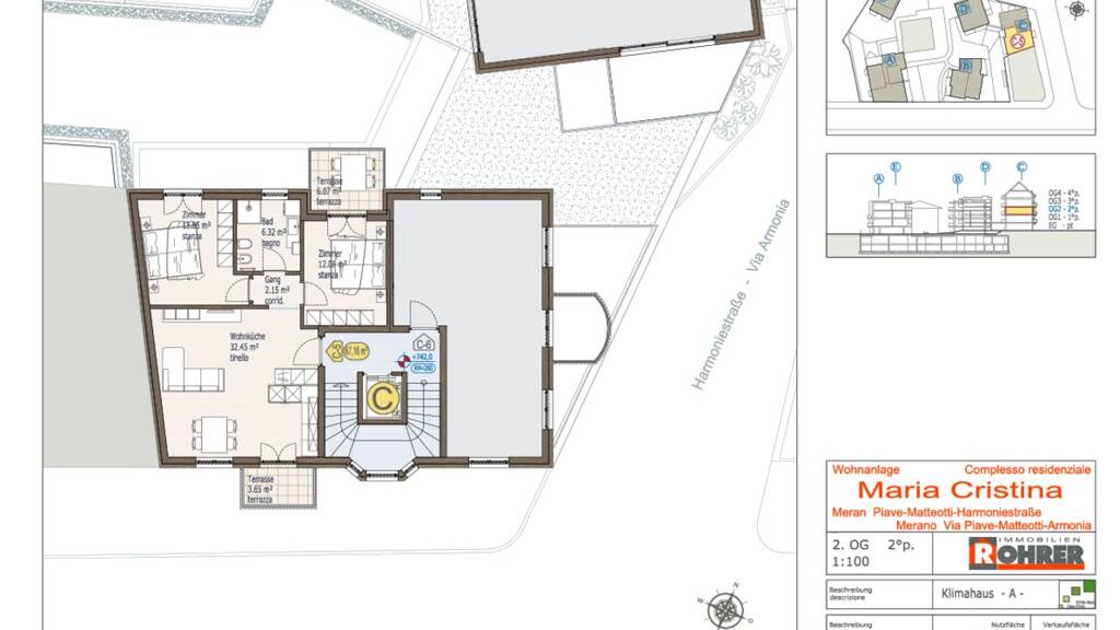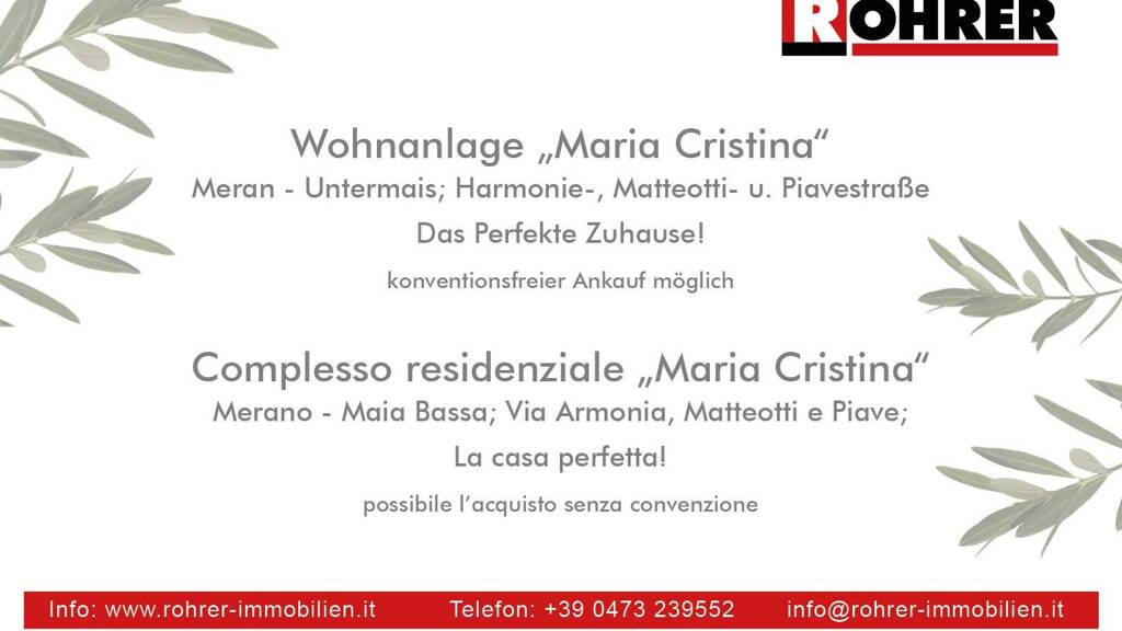 In sonniger zentraler Lage mit Weitblick auf das umliegende Etschtal, realisiert der Bauträger Rohrer Immobilien die Wohnanlage „Maria Cristina“. In unmittelbarer Nähe befinde sich die Bushaltestellen und die Fahrradwege. Zu Fuß sind die wichtigsten Geschäfte der Nahversorgung, Apotheke, Gastronomiebetriebe, Ärzte, Kindergarten, Schule, Therme und die Meraner Altstadt bequem erreichbar. Energiestandart - Klima Haus A-Nature