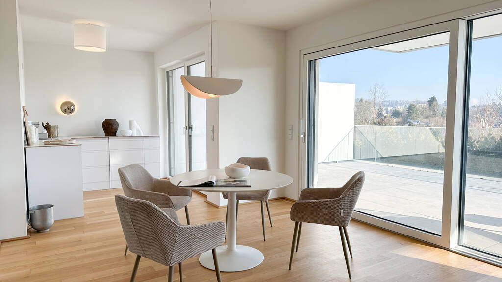 Die großzügigen Glasflächen und die Balkone eröffnen Ihnen ein großartiges Panorama sowie wunderschöne Ausblicke. Und für besondere Heimkinoerlebnisse sorgen Raffstores fürs richtige Ambiente.