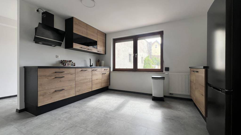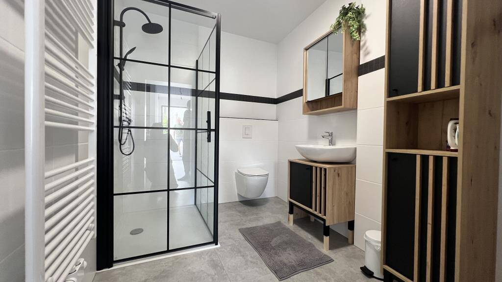 - Wohnung 3, 1.Obergeschoss (Anbau), 2,5-Zimmer Wohnung, ~56 m², im Jahr 2025 vollständig saniert inkl. Leitungen und Dämmung: offener Koch-/Essbereich, mit Vinylboden in moderner Fliesenoptik in grau, vollwertig ausgestattete und moderne Einbauküche mit Fronten in Holzoptik, stylisches Wohn- und Schlafzimmer dank Sichtbalken und Vinylboden in Parkettoptik, 2-fach verglaste Holzfenster in gutem Zustand mit manuellen Rollläden, saniertes Badezimmer mit bodengleicher Dusche (verglaste Duschkabine in Loftoptik), Handtuchheizkörper und eigener Waschmaschinenanschluss vorhanden, moderne Badmöbel mit freistehendem Waschbecken, eigener Gartenanteil sowie separater Wohnungszugang