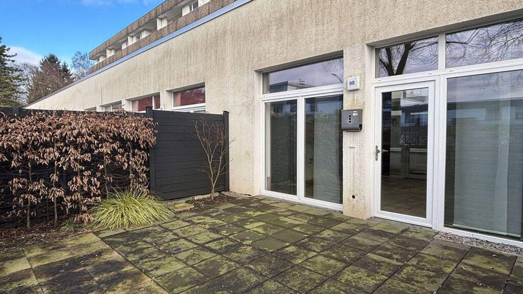 Die Wohnung beeindruckt mit einer großzügigen Terrasse, die mit quadratischen Steinplatten ausgelegt ist und einen Blick in den gepflegten Garten bietet. Die zentrale Heizungsanlage sorgt für wohlige Wärme, während die hohen Fenster viel Tageslicht hereinlassen. Zu den weiteren Annehmlichkeiten gehören ein Kellerraum, der zusätzlichen Stauraum bietet.