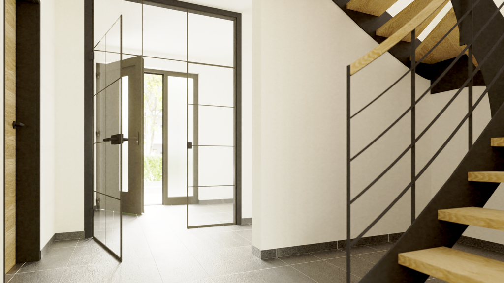 Bodentiefe Fenster lassen viel Tageslicht in die Wohnräume und sorgen für eine helle, freundliche Atmosphäre. Im Obergeschoss bieten moderne Brüstungsgeländer nicht nur Sicherheit, sondern runden das elegante Design des Hauses ab.