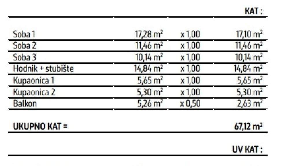 KAT; tri sobe, hodnik, stubiste, dvije kupaonice, balkon povrsine 5,26 m2 ( neto 2,63 m2).
