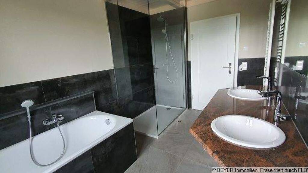 Modernes Tageslichtbad mit Badewanne, Dusche, Doppelwaschbecken und WC