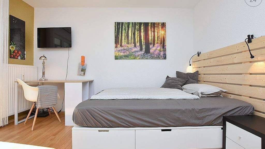 Helles, modern möbliertes 1-Zimmer Apartment mit Terrasse, Garten zur gemeinschaftlichen Nutzung und WLAN in direkter Nähe zur Uni Hohenheim in Stuttgart Plieningen.