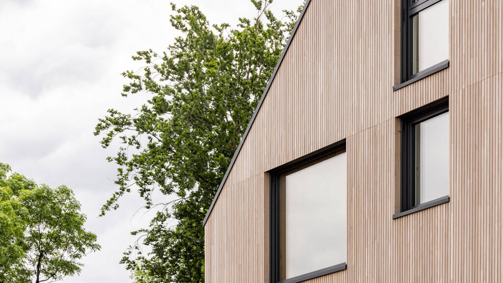 Von außen ist die prächtige Holz-Fassade des Neubaus mit seinen klassischen Stilelementen absolut beeindruckend und verleiht dem 8-MFH seinen starken, nachhaltigen Charakter.