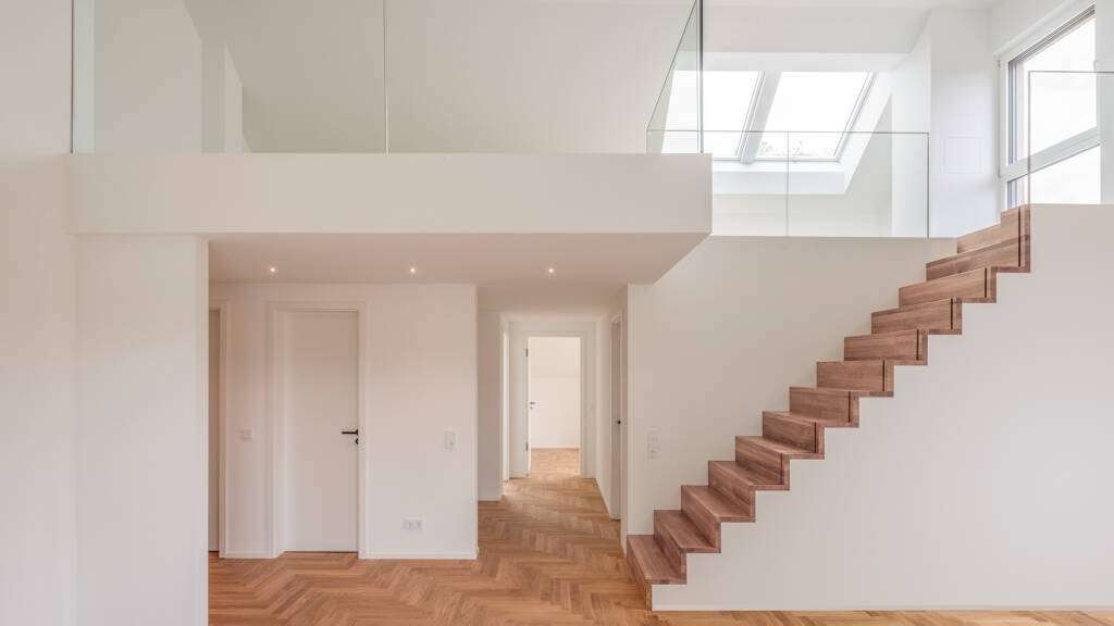 Das luxuriöse Raumgefühl ist geprägt von klugen Raumaufteilungen (u.a. zwei Schlaf-/Kinder-/Arbeitszimmer) die sich z.B. auch für das Einbauen von Schreinermöbeln anbieten. Die Bäder / WCs mit hohem Standard beinhalten eine überdimensional große Dusche, genügend Platz und das kluge Platzieren von Waschmaschine / Trockner. Eine hochwertige Küche rundet einen tollen Gesamteindruck ab. Über eine harmonisch integrierte Holztreppe gelangen Sie in das Maisonette Geschoss, welches mit seiner großen Nutzfläche ein nahezu eigenes zweites Stockwerk darstellt, das perfekt in die Gemütlichkeit eines Alltags integriert werden kann. Von dort überblicken Sie den hellen Wohnraum aber auch die dimensionale Küchennische, die in unmittelbarer Umgebung auch einen Abstellraum bietet.