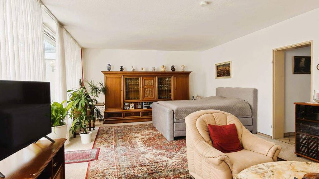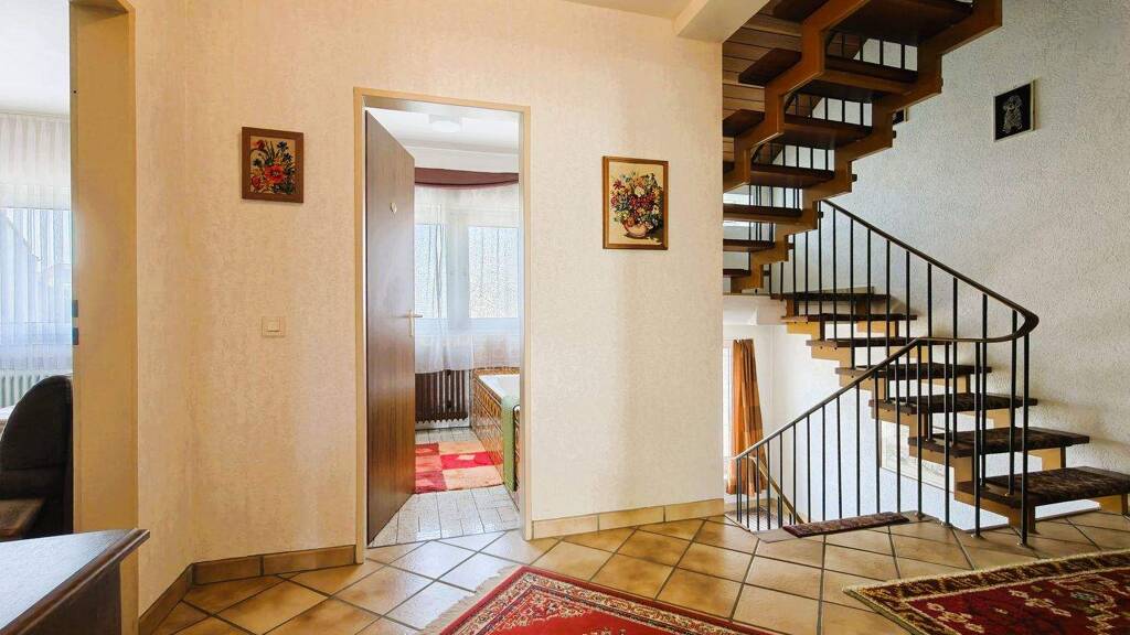 Das Obergeschoss verfügt über drei Schlafzimmer, von denen zwei Zugang zur großen Loggia mit Weitsicht haben. Die Loggia bietet eine weitere Erholungsfläche mit grüner Aussicht. Komplettiert wird das Obergeschoss durch ein Badezimmer mit Badewanne und großem Fenster. Das Badezimmer befindet sich noch im Charme der 70er Jahre. Alle Räume sind ansprechend groß und lichtdurchflutet.