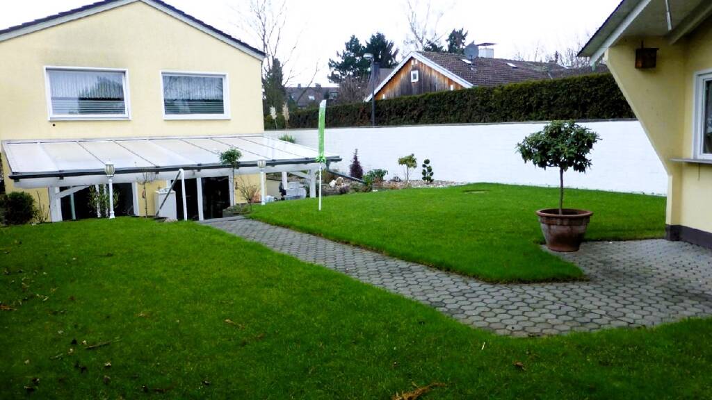 Gleichzeitig geben sie den Blick frei auf die Terrasse und weiter in den pflegleicht angelegten Garten. Die Terrasse bieten mit üppigen Größen Ihrer Gartenlounge mehr als ausreichend Platz. Der junge Garten zeigt sich als Rasenfläche mit einem Gartenhäuschen gestaltet und ist rundum eingefriedet.