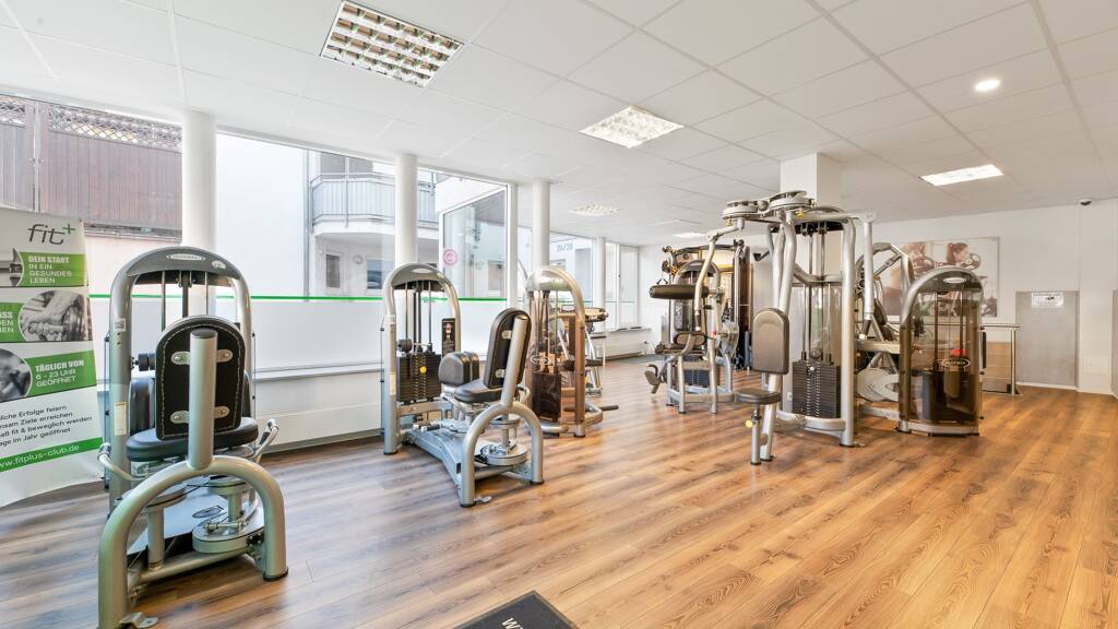 Derzeit wird die Fläche als Fitnessstudio genutzt und überzeugt durch eine durchdachte Raumaufteilung. Im Erdgeschoss befindet sich der einladende Trainingsbereich, der durch große Fensterfronten mit viel Tageslicht versorgt wird.