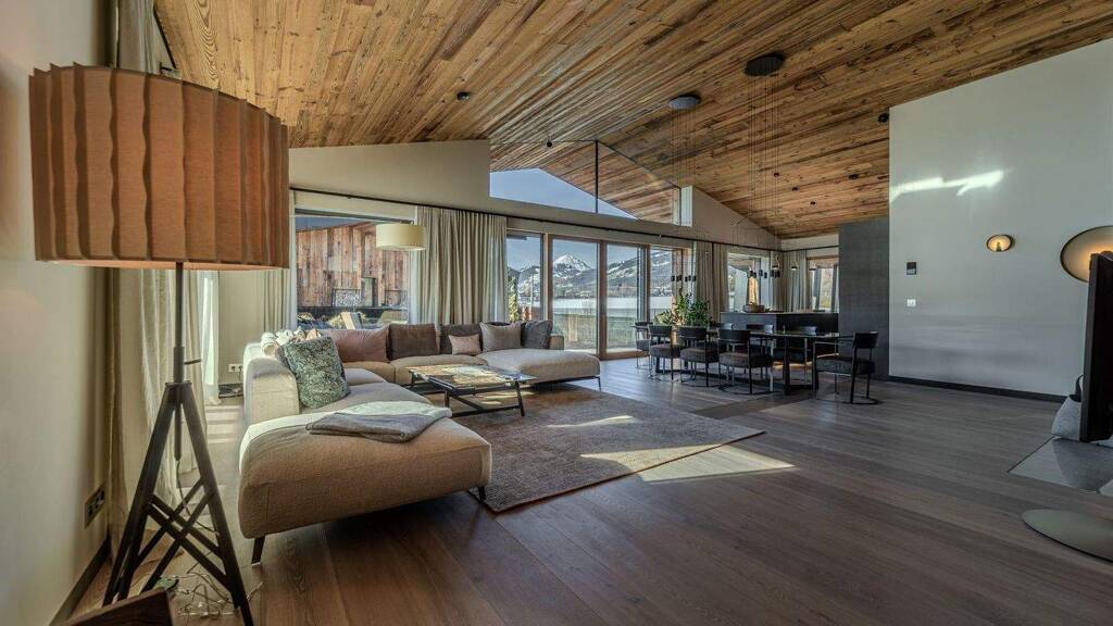 Das hier angebotene Penthouse wurde planerisch äußerst geschickt konzipiert und beeindruckt neben der sehr hochwertigen Bauqualität mit einer äußerst gelungenen Möblierung. Die Fassade des Gebäudes weist in den oberen Etagen typische Kitzbüheler Details wie Altholz auf sowie edle Wandverkleidungen in Sichtbetonoptik im Erdgeschoss. Der wunderbar gestaltete, umlaufende Balkon mit satinierten Glasbrüstungen, großzügige Fenster- und Terrassenfronten sowie eine einladende Außenanlage runden das edle Gesamtbild ab.