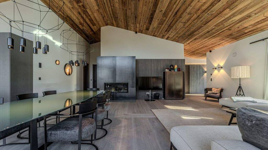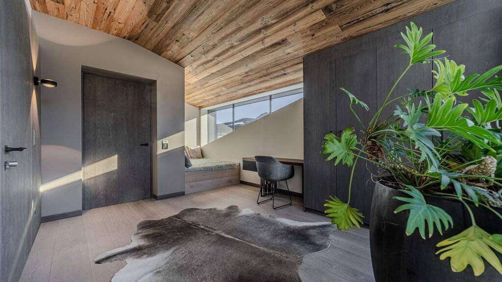 Beim Betreten der Wohnung gelangen Sie in den großzügigen Eingangsbereich, welcher mit seinen ca. 17 m² ausreichend Platz für eine Garderobe bietet. Hier befindet sich auch ein ganz besonderes "Schmankerl" - eine verglaste Liegefläche mit Blick zur Fleckalm. Das Highlight dieser Einheit ist der exklusive, offen gestaltete Wohn- und / Essbereich mit einer herrlichen Profiküche, dem mit Metall verkleideten Kamin, sowie dem einladenden Esstisch. Die drei Schlafzimmer wurden mit noblen Bädern en suite versehen und laden zu ausgiebigem Entspannen ein. Insbesondere das Masterzimmer mit Masterbad präsentiert sich mondän und exklusiv. Abgerundet wird diese Einheit von dem praktischen Abstellraum sowie einer Gästetoilette.