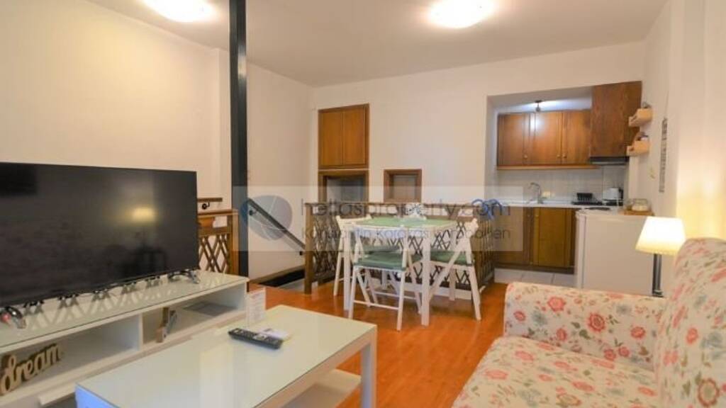 Durch den Eingang im Erdgeschoss gelangt im Flur, Wohnzimmer mit Essbereich und Einbauküche, Badezimmer und Zugang zur Terrasse. Mit einer Innentreppe kommt in den Soutterain-Bereich, wo sich das Schlafzimmer befindet.