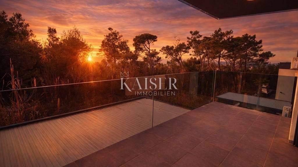 Vom Wohnzimmer aus gelangt man auf die überdachte Terrasse, die sich ideal zum Verweilen im Freien und Genießen des mediterranen Flairs mit teilweisem Meerblick eignet.