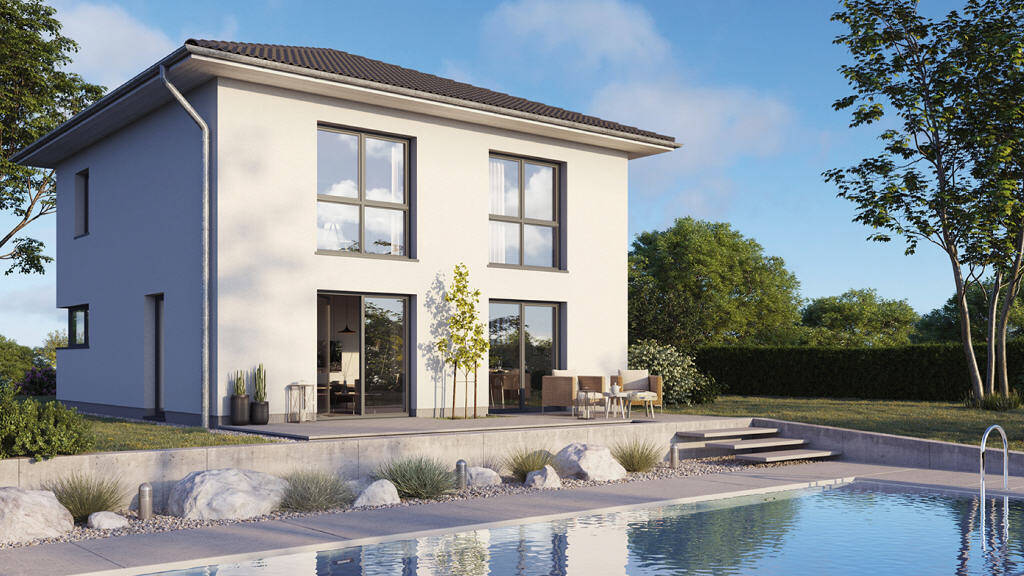 Als modernen Bebauungsvorschlag schlagen wir ein Haus-Projekt mit 129 qm Wohngrundfläche vor. Die Stadtvilla bietet 5 Zimmer, Küche, Vollbad, WC, Abstellen und Hauswirtschaftsraum. Es handelt sich hierbei um einen KfW-40-Standard mit Luftwärmepumpe und Fußbodenheizung. Die Beschattung der Fenster erfolgt mit elektrischen Rollläden