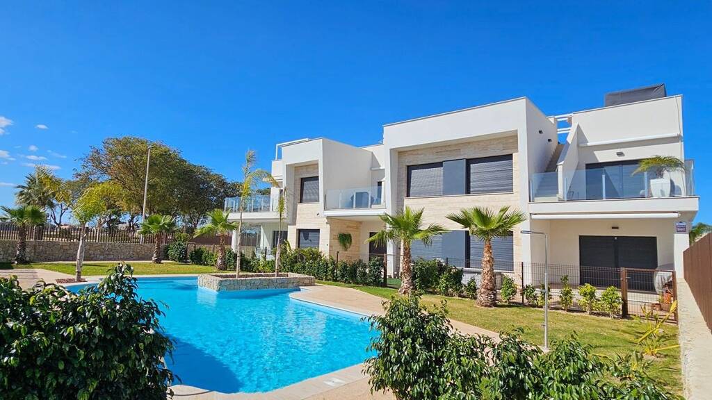 Die Innenräume bieten einen hellen und modernen Raum mit offenem Wohn- und Essbereich, Küche, Hauptschlafzimmer mit eigenem Bad, ein weiteres Doppelschlafzimmer und Gästebad. Durch die Terrassentüren im Wohnzimmer gelangt man auf die Terrasse, um das Leben im Freien in der Sonne zu genießen. Die Wohnungen verfügen über eine Vorinstallation für eine Klimaanlage, einen Parkplatz und die Bewohner können den schönen Gemeinschaftspool und den Gartenbereich mitbenutzen.