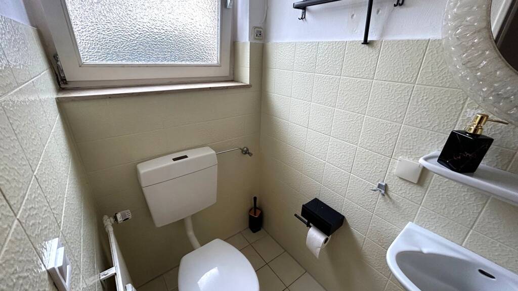 Die separate Küche ist funktional angeordnet und bietet ausreichend Raum für den täglichen Bedarf. Das Vollbad präsentiert sich komfortabel ausgestattet mit Badewanne, Dusche, Fenster sowie einem Doppelwaschtisch und erfüllt damit gehobene Ansprüche an Alltagstauglichkeit. Ergänzt wird das Raumangebot durch ein Gäste-WC mit Fenster, was insbesondere für Familien oder Besucher zusätzlichen Komfort schafft.